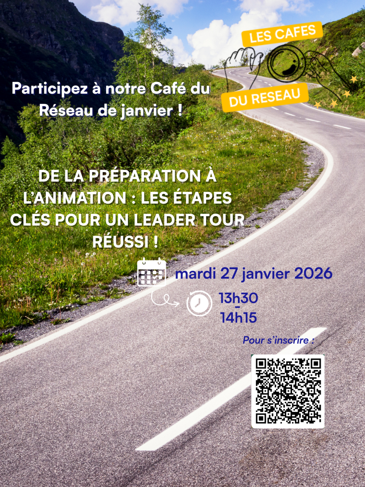 Événement - Webinaire Café du Réseau "De la préparation à l’animation : Les étapes clés pour un LEADER Tour réussi" Grand-Est Services à la population et aux entreprises Territoires LEADER Du 27 janvier 2026 au 27 janvier 2026 Horaires : de 13h30 à 14h15 Inscrivez-vous ! Café du Réseau de janvier 2026 / Réseau Rural et Agricole Grand Est Comme chaque dernier mardi du mois, nous vous retrouverons au mois de janvier pour un nouveau Café du Réseau, le 27 janvier 2026, sur l'organisation d'un LEADER Tour. Qu'est-ce qu'un "Café du Réseau" ? Réunir des partenaires ou des curieux autour d’une thématique donnée lors d’un webinaire de 45min top chrono ! Il s’agit d’un moment pour échanger autour de réalisations ou d'inspirations développées sur les territoires ruraux et agricoles. Une belle occasion de valoriser et d'informer sur les projets financés par les fonds européens sur le territoire Grand Est (ou ailleurs). Et qu'est-ce qu'un LEADER Tour ? Un LEADER Tour est un événement permettant aux acteurs d'un territoire de découvrir des projets financés par le programme européen LEADER (Liaison Entre Action de Développement de l’Économie Rural) et des initiatives innovantes. Rendez-vous le mardi 27 janvier 2026 pour découvrir les secrets d'un LEADER Tour réussi ! Contenus similaires Les "cafés réseau" du Réseau Rural et Agricole Grand Est font leur grand retour ! Grand-Est Services à la population et aux entreprises Actualité 3 février 2025 Le réseau européen des élus locaux : un nouvel outil de Commission européenne pour aller vers les citoyens ! Europe Services à la population et aux entreprises Actualité 21 novembre 2025 Synergies entre CAF et LEADER autour de l’action sociale rurale Normandie Services à la population et aux entreprises Actualité 7 novembre 2025 Comment garantir une mobilité durable et équitable pour les zones rurales ? Europe Services à la population et aux entreprises Territoire et gestion de l’espace Actualité 29 octobre 2025